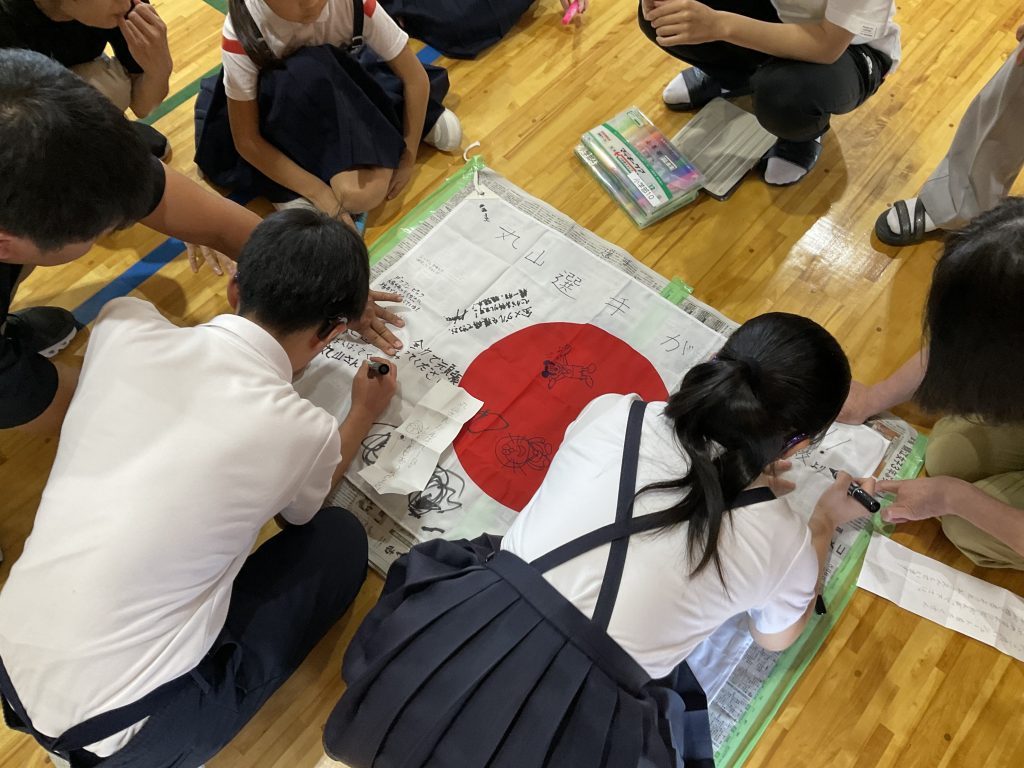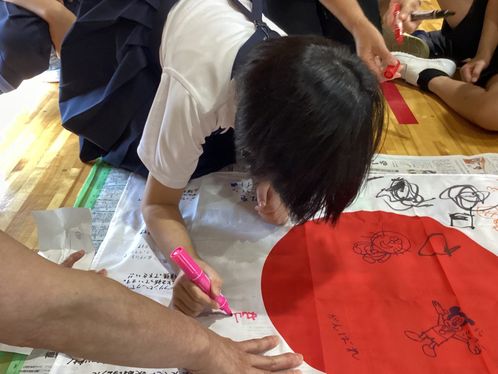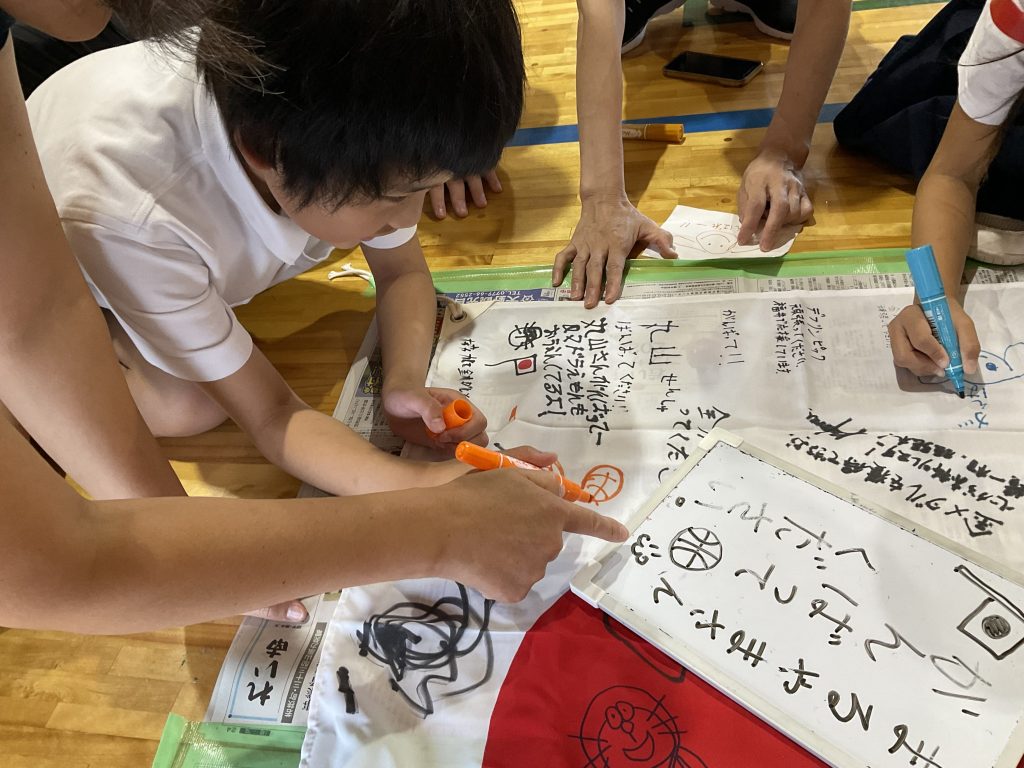 そして福井県鯖江市出身のデフバスケットボール選手、丸山香織さんに向けて応援のメッセージを寄せ書きしました。丸山さんには昨年、小学部に来ていただき、授業や一緒にバスケをしていただきました!児童たちは「がんばれ!」「かっこいい姿を見せてください!」など思い思いの応援メッセージを書いていました!