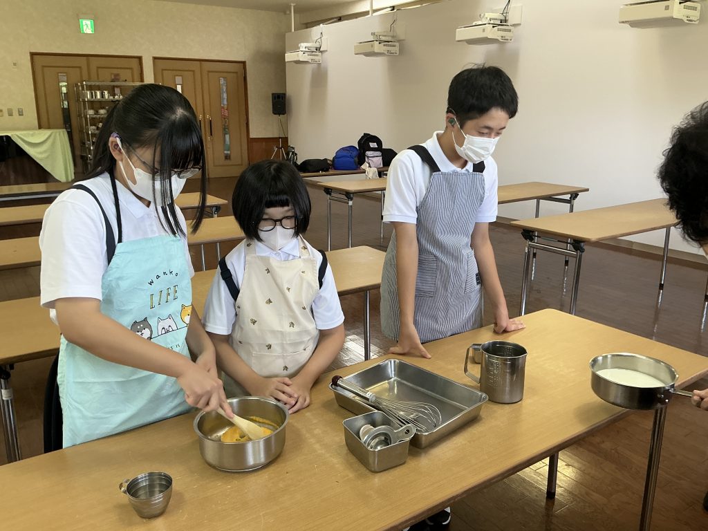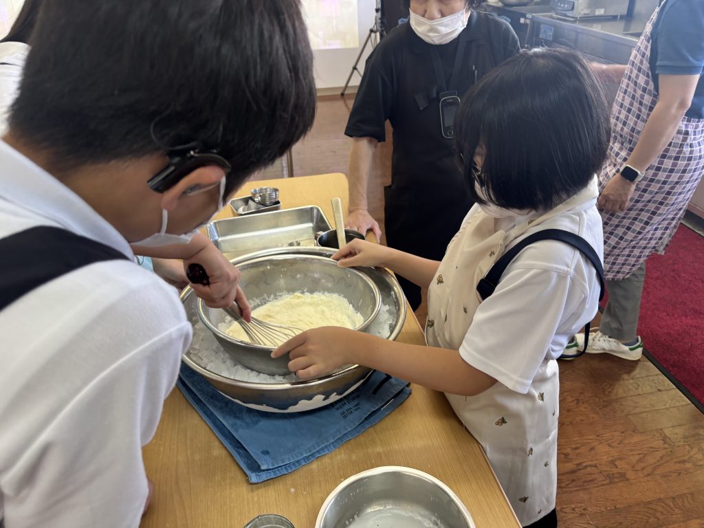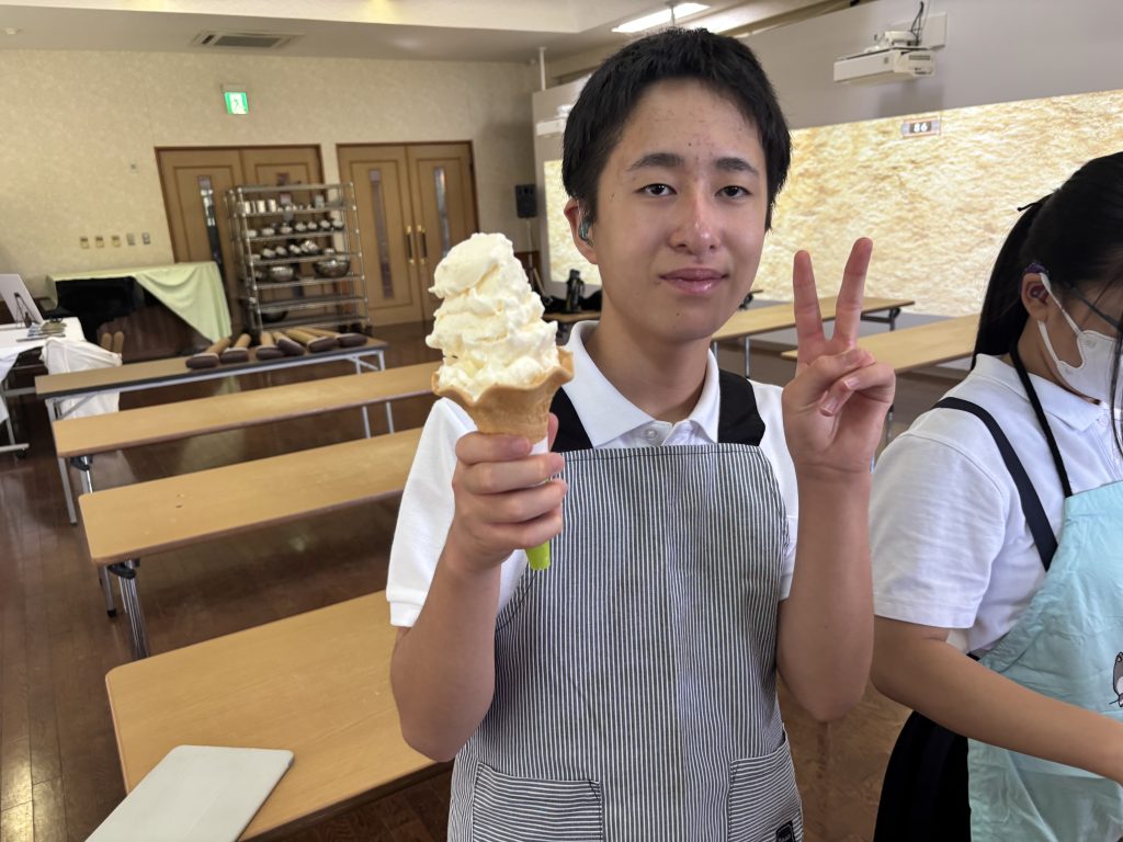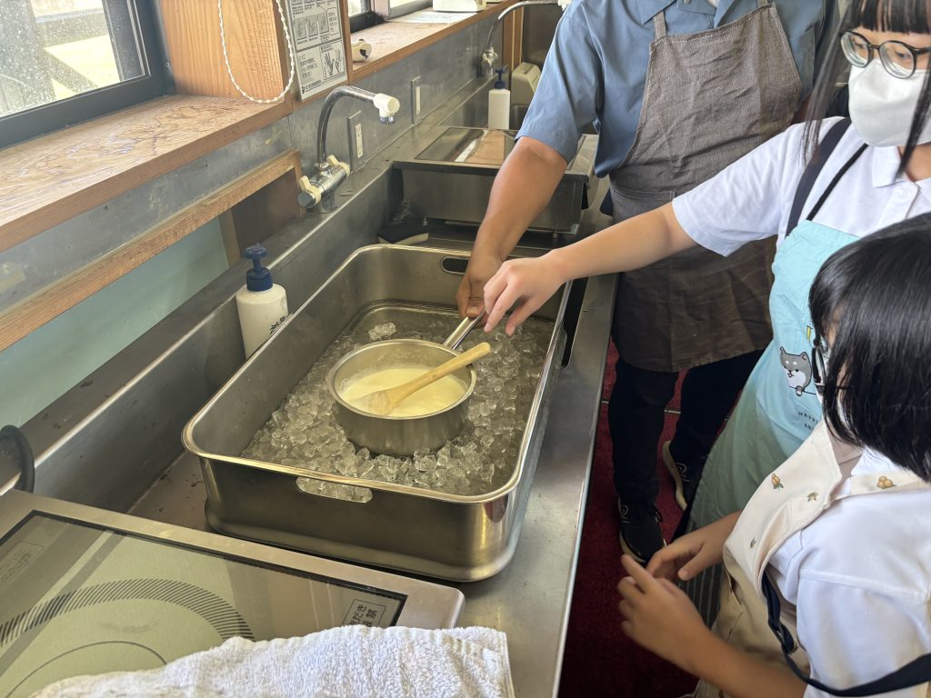 ミルク工房ではアイス作り体験をしました。牧場のミルクを使い、3人で協力してバニラアイスを作りました。