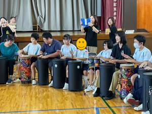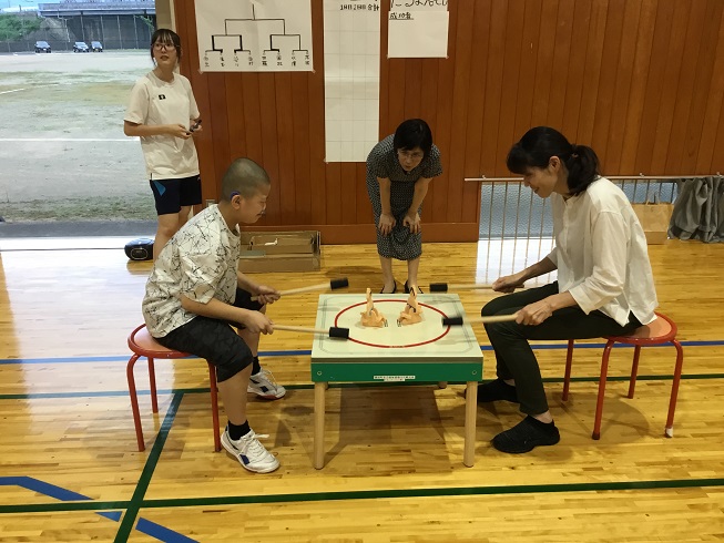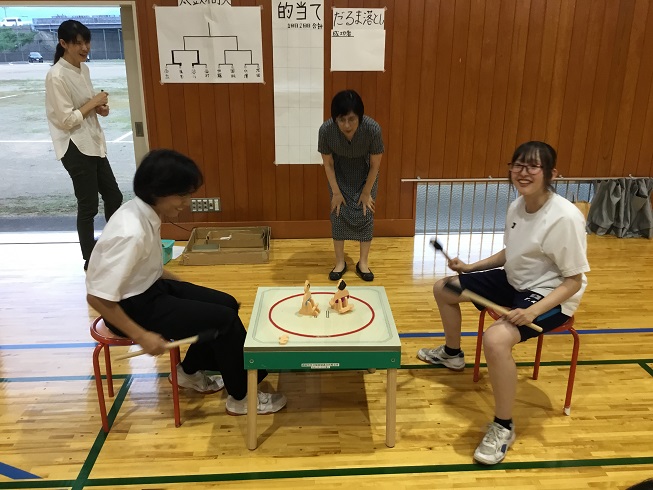 舎生たちは土俵の部分をバチで小刻みに叩いたり、叩く位置を変えたりしながら、自分が選んだ力士を操っていました。力士が倒れそうになったり、土俵から出そうになったりすると「あー!」とか「負ける!」などと言った声が上がっていました。力加減が少々難しかったようでしたが、大変盛り上がりました。