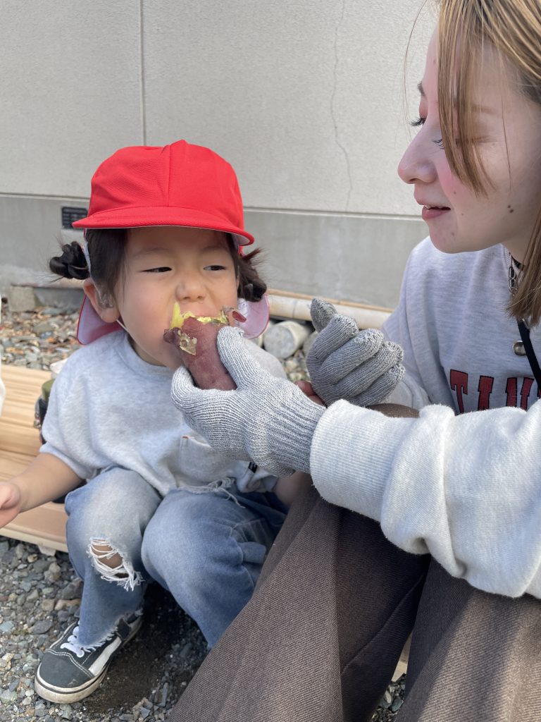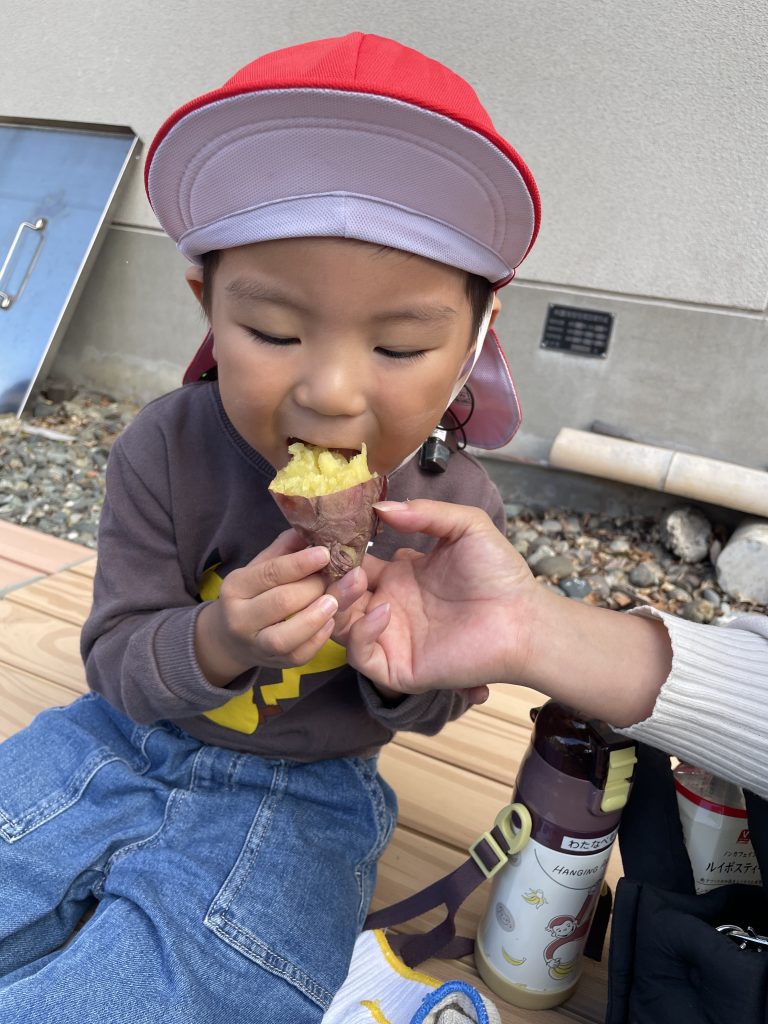 11/4(火)にやきいも会を行いました。子どもたちが5月に植えたサツマイモが大きくなり、やきいも会では、育てたサツマイモを食べました。なんとラグビーボールのようなサツマイモもありました!!