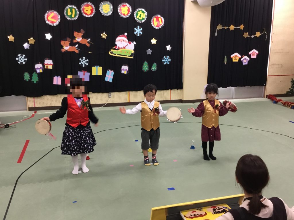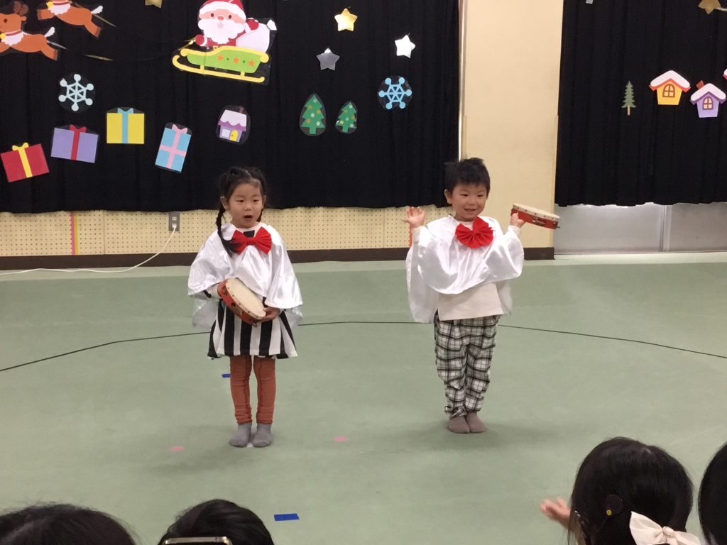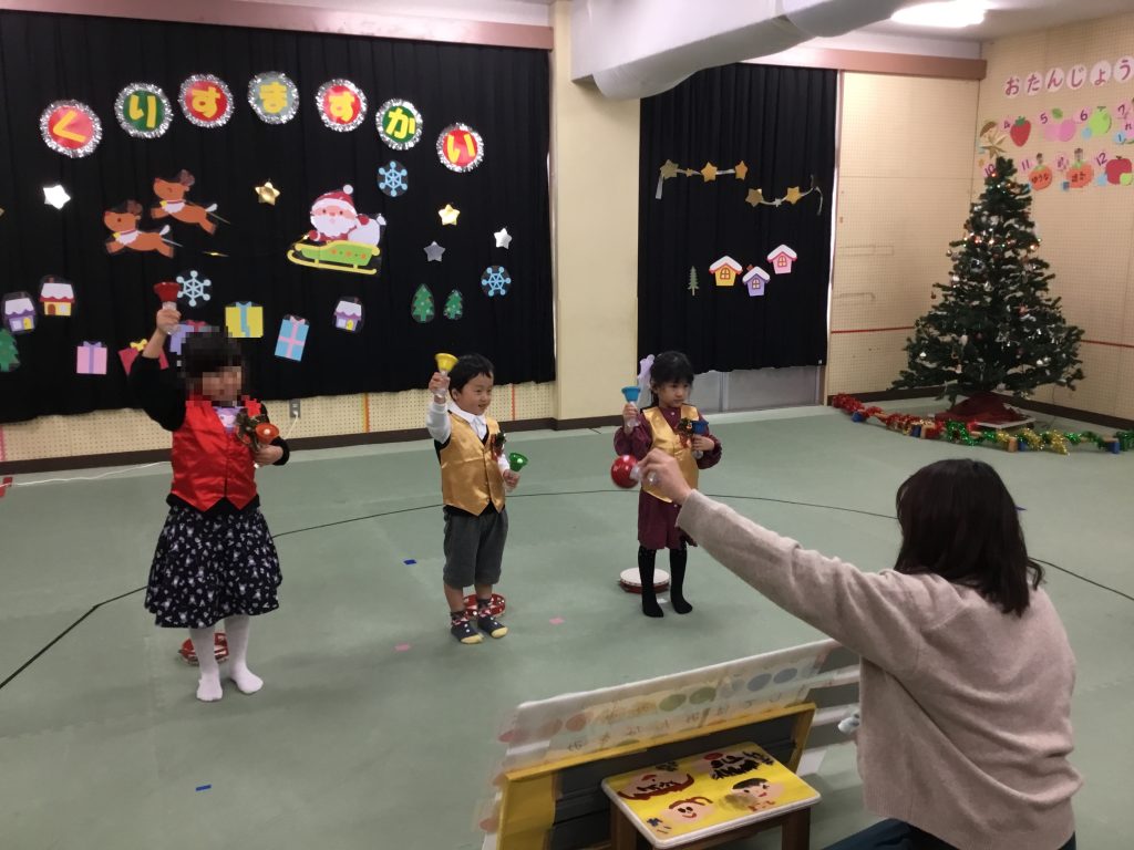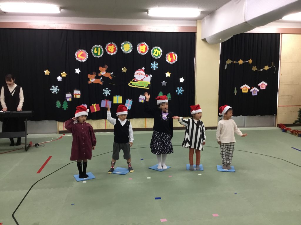 12/9(火)に幼稚部のクリスマス会がありました。最初は、全員で「あわてんぼうのサンタクロース」を歌いました。そのあと、うさぎ組は「おもちゃのチャチャチャ」、さる・らいおん組は「ジングルベル」「きらきらぼし」の発表をしました。練習の成果をお母さんやお父さんに見せることができ、こどもたちは満足した表情を浮かべていました。