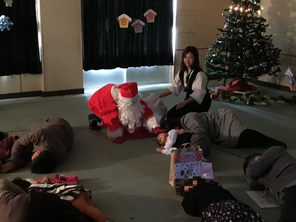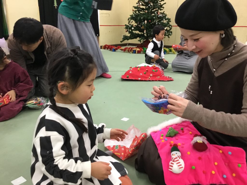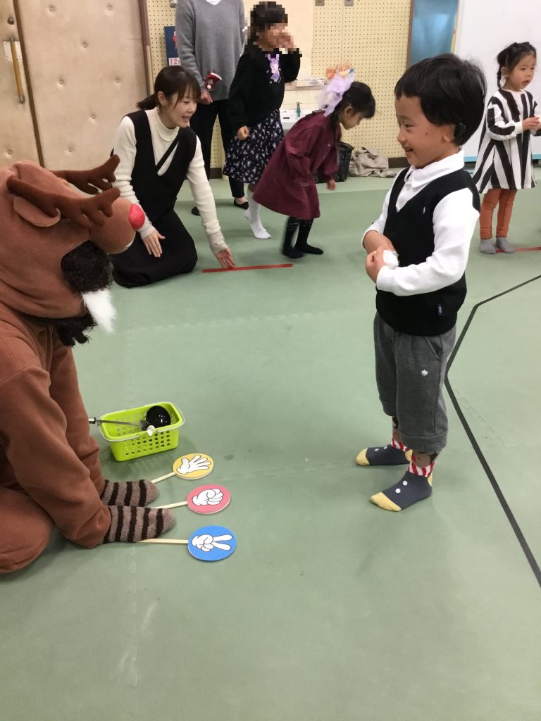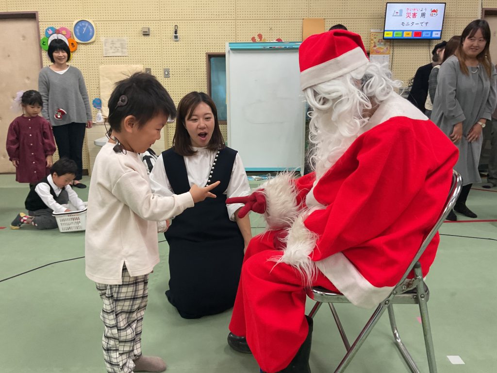 発表後には、こどもたちが会いたがっていたサンタさんとトナカイさんが来てくれました。サンタさんからプレゼントをもらい、こどもたちはドキドキワクワク!中には、おもちゃやお菓子が入っていて大満足でした。サンタさん、トナカイさんと一緒に写真を撮ったり、ゲームをしたりと楽しい時間を過ごすことができました。