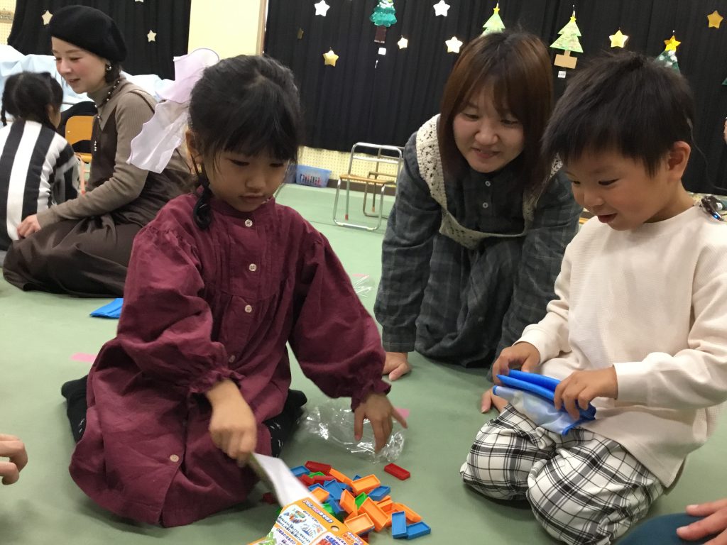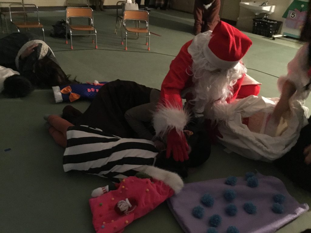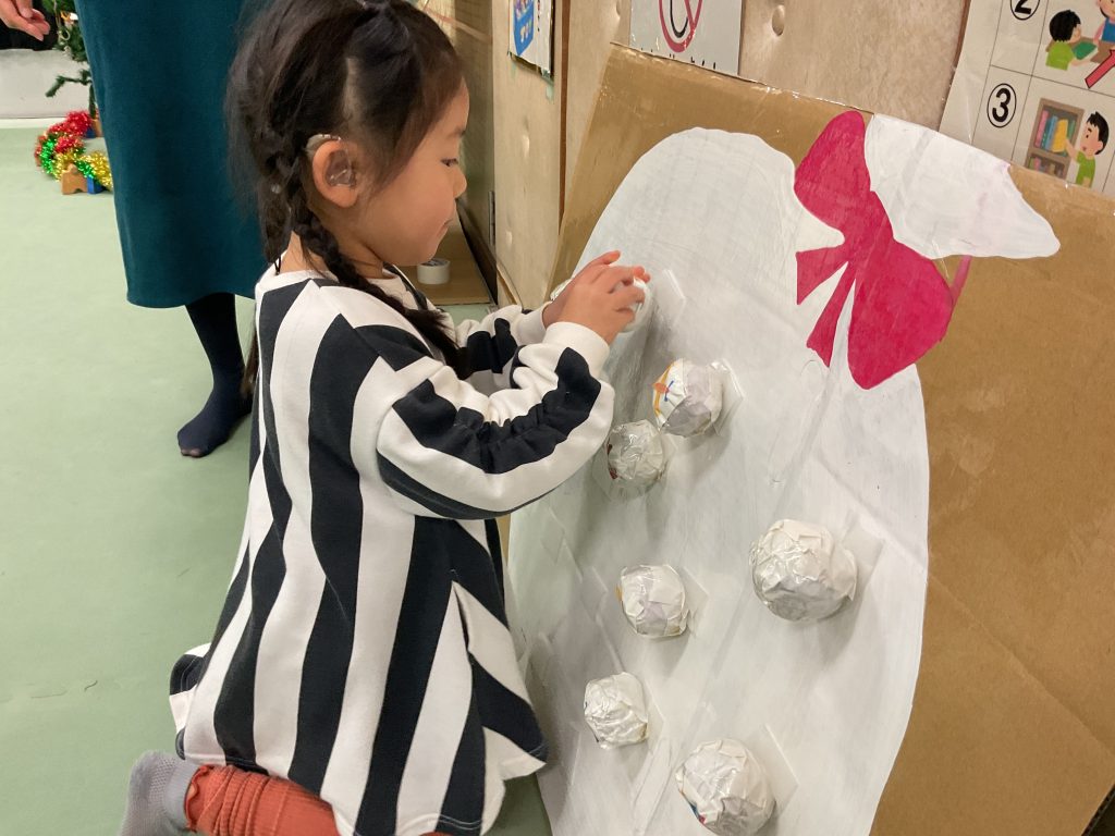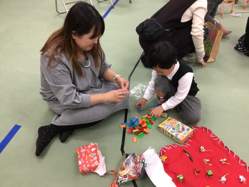 発表後には、こどもたちが会いたがっていたサンタさんとトナカイさんが来てくれました。サンタさんからプレゼントをもらい、こどもたちはドキドキワクワク!中には、おもちゃやお菓子が入っていて大満足でした。サンタさん、トナカイさんと一緒に写真を撮ったり、ゲームをしたりと楽しい時間を過ごすことができました。