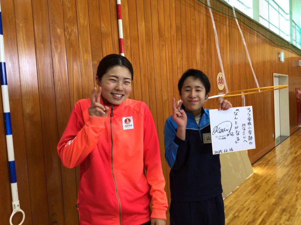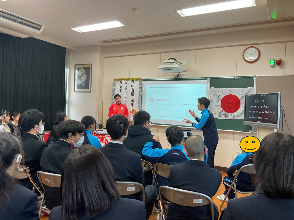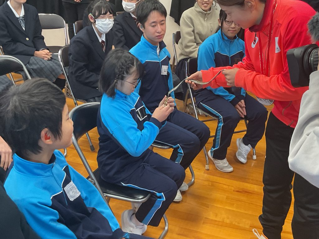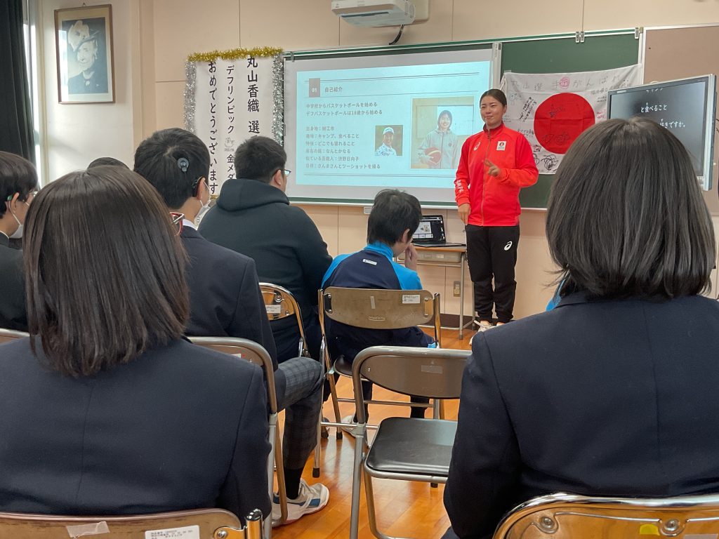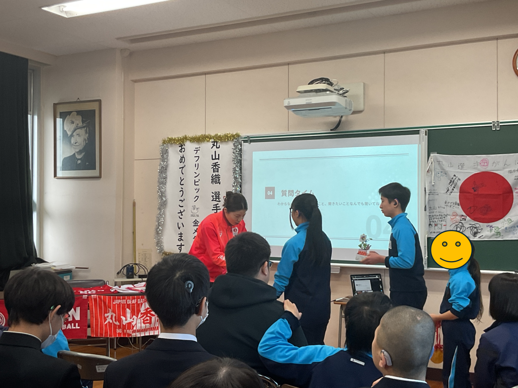 2025年11月に東京で開催されたデフリンピック 女子バスケットボール競技で金メダルを獲得した福井県立ろう学校幼稚部出身の丸山香織選手が12月16日来校されました。子どもたちは丸山さんからデフバスケットボールのお話を聞いたり、丸山さんに質問をしたりして、デフバスケットボールについて理解を深めていました。