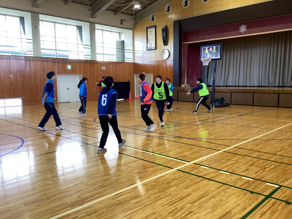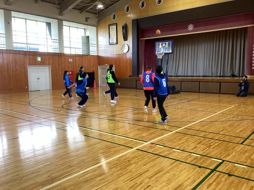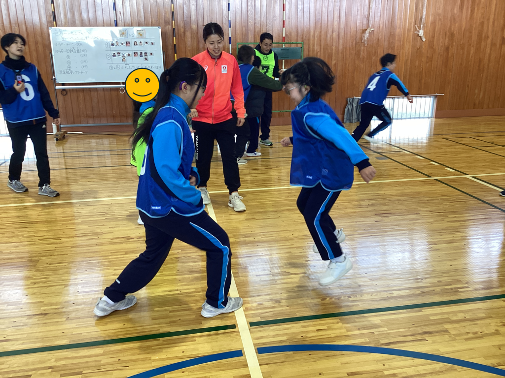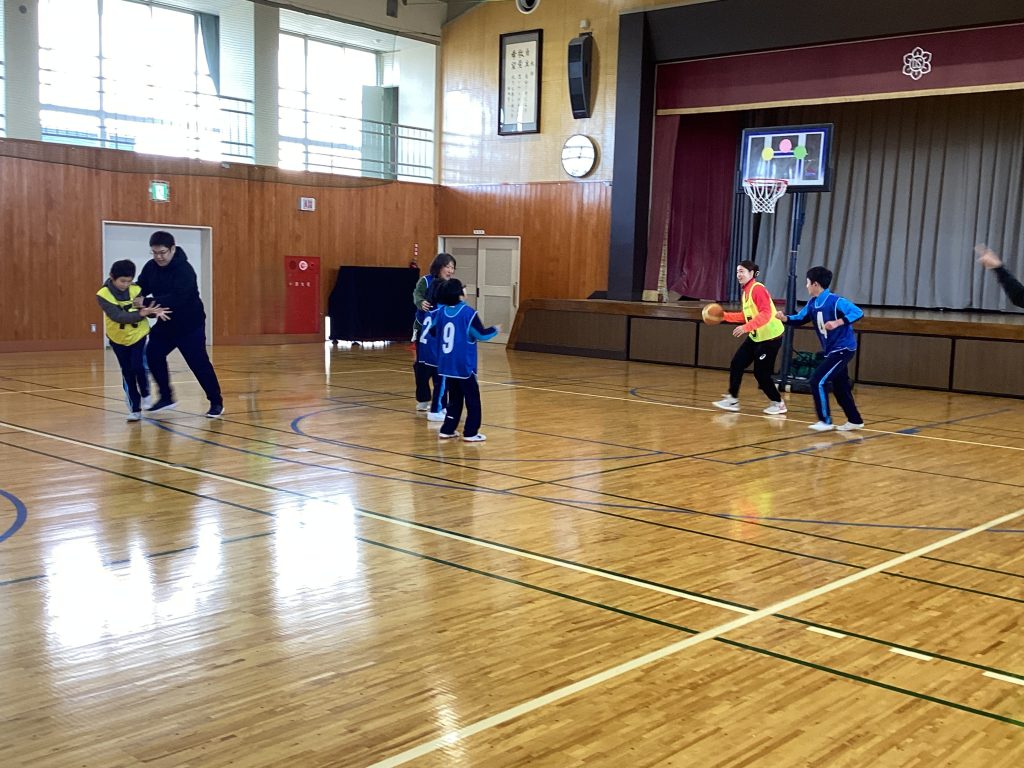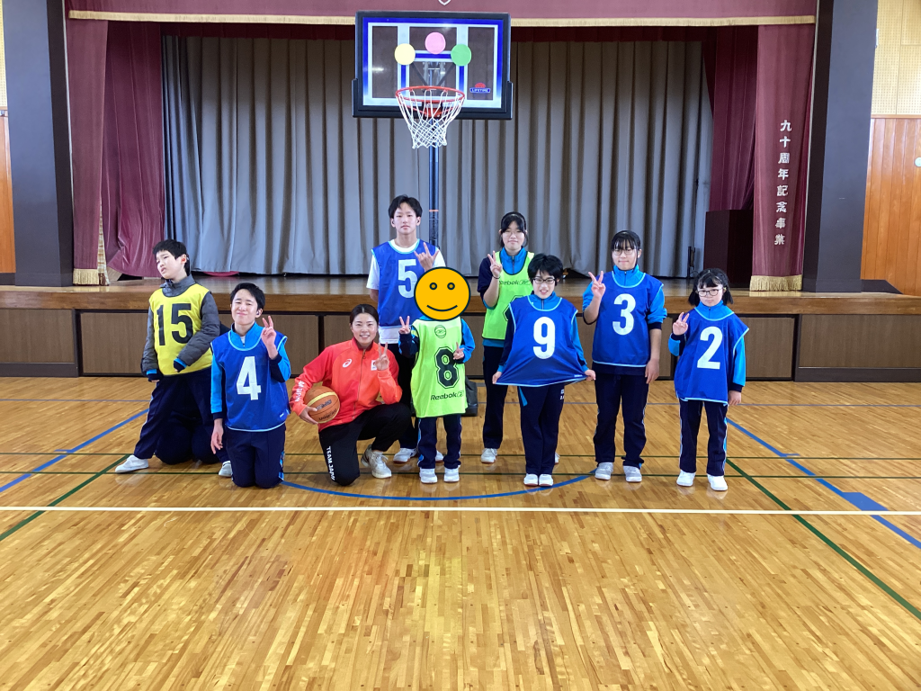 お話を聞いた後、体育館に移動し、小学部児童5人と中学部生徒3人は丸山さんと一緒にバスケットボールをしました。準備運動では丸山さんから足で行うじゃんけんを教えてもらいました。子どもたちは「少し難しい」と言いながらも、とても楽しそうに行っていました。バスケットボールでは、丸山さんからパスを受けてシュートを打つことや丸山さんにボールをパスしてシュートを決めてもらうなど丸山さんと協力しながらバスケットボールをしました。子どもたちは「たくさん動いて疲れたけど、楽しかった!」「丸山さんと一緒にバスケットボールできてうれしい」といった感想を述べていました。