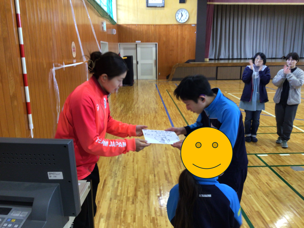 丸山さんはデフバスケットボールで獲得した金メダルをお持ちくださり、特別に子どもたちは金メダルを触ることができました。金メダルを持った子どもたちは 「大きくて重たい」「金メダルってすごい」ということを実感することができました。お話を聞いた後に、小学部児童からプラントポットと手作りの金メダルをプレゼントしました。そしてがんばってくださいの意味を込めて手話でエールを送りました。とても素晴らしい時間を過ごすことができました。