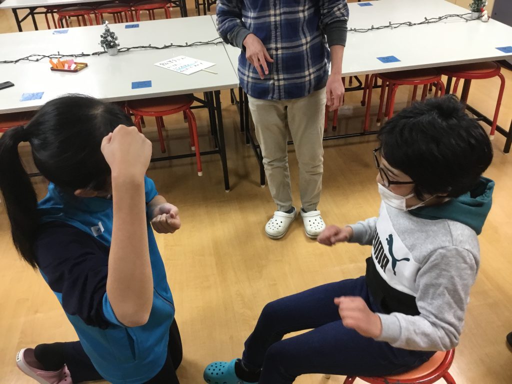 まず、「伝言ゲーム」をしました。お題は「お猿さん」です。舎生たちはゆっくり口を動かしながら口パクで伝えたり、ジェスチャーで伝えたりして奮闘していました。口パクは口形を読み取ることが難しく苦戦していました。答えが発表されると、上手く伝わっていないところもありましたが、大変盛り上がりました。
