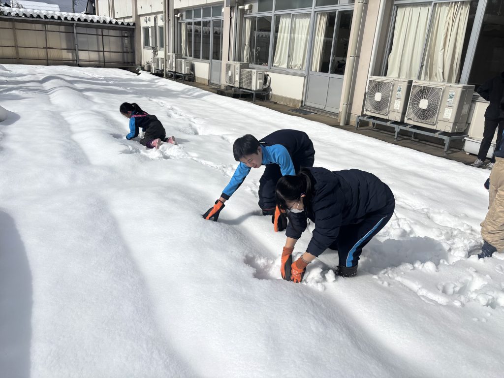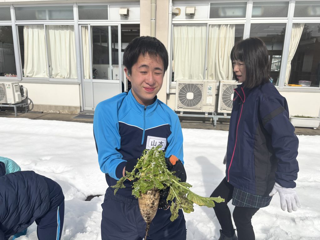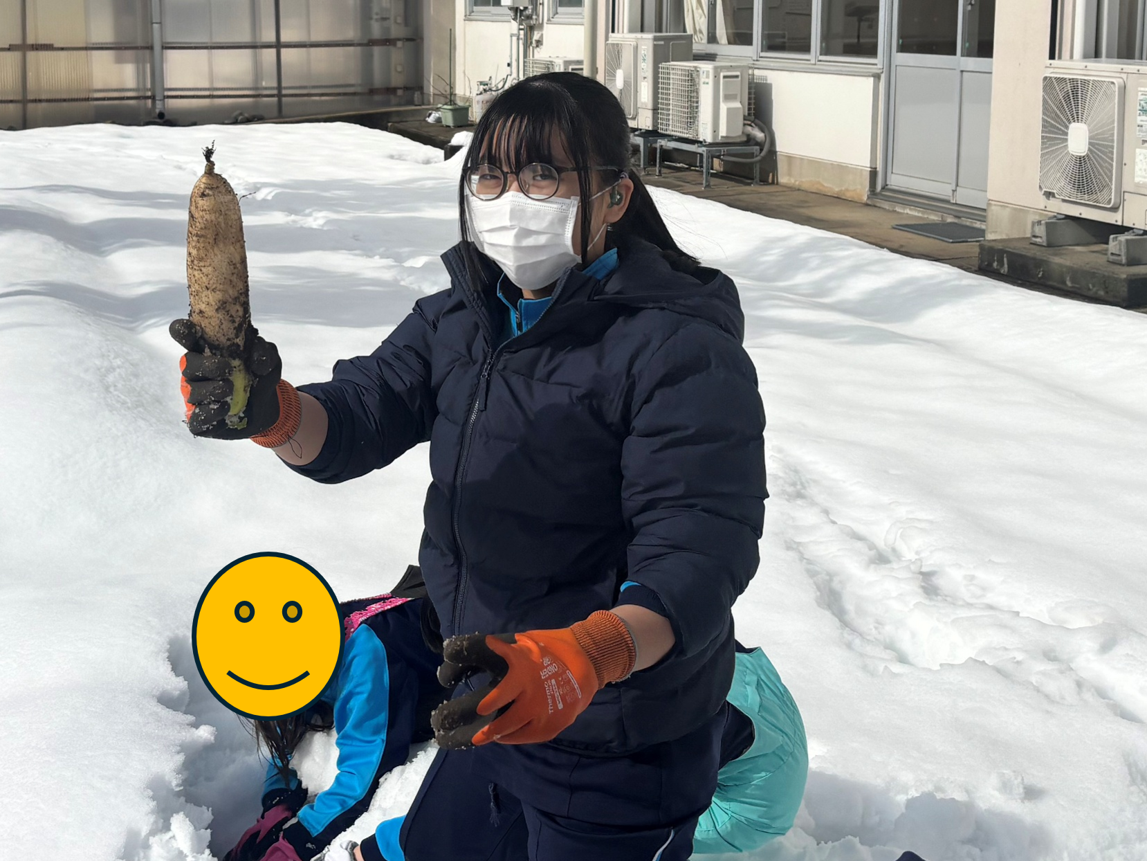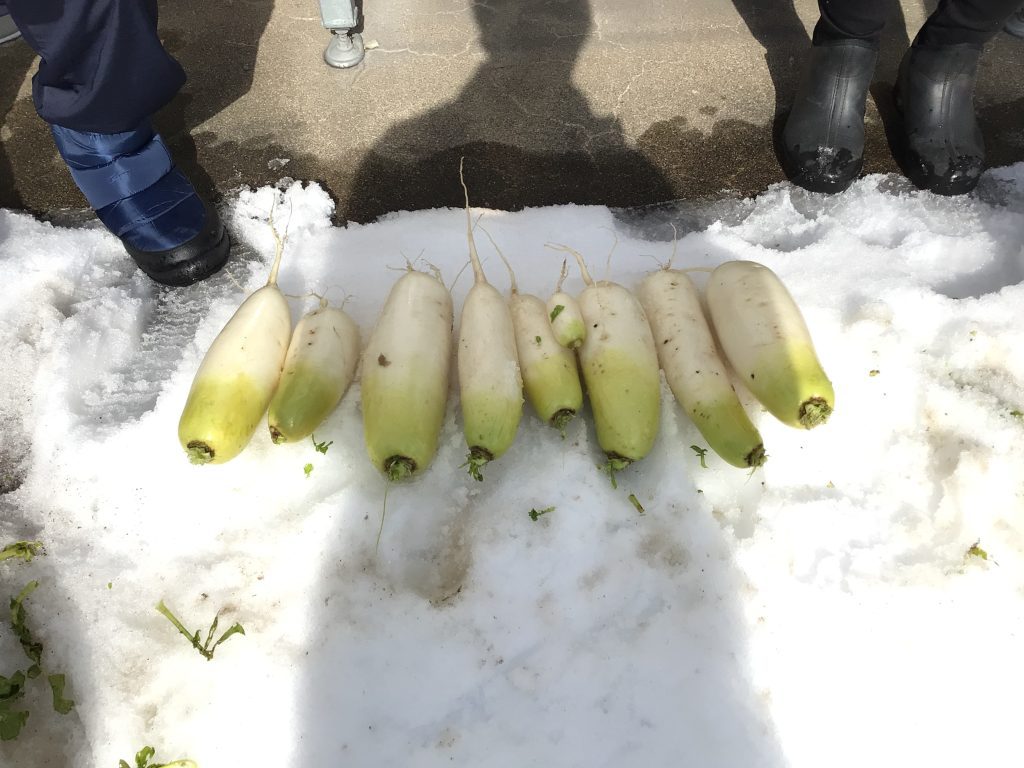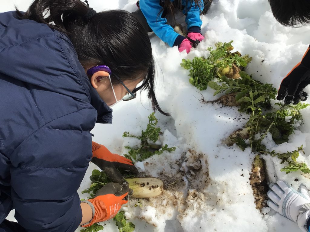 1月28日の4時間目、雪の中の大根を収穫しました。11月のときに一度収穫したものとは、ひとまわりもふたまわりも大きく成長した立派な大根を収穫することができました。雪の中を掘って大根を見つけ出し、みんなで楽しく収穫しました!