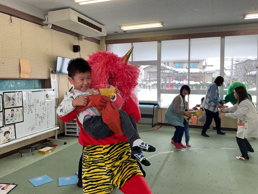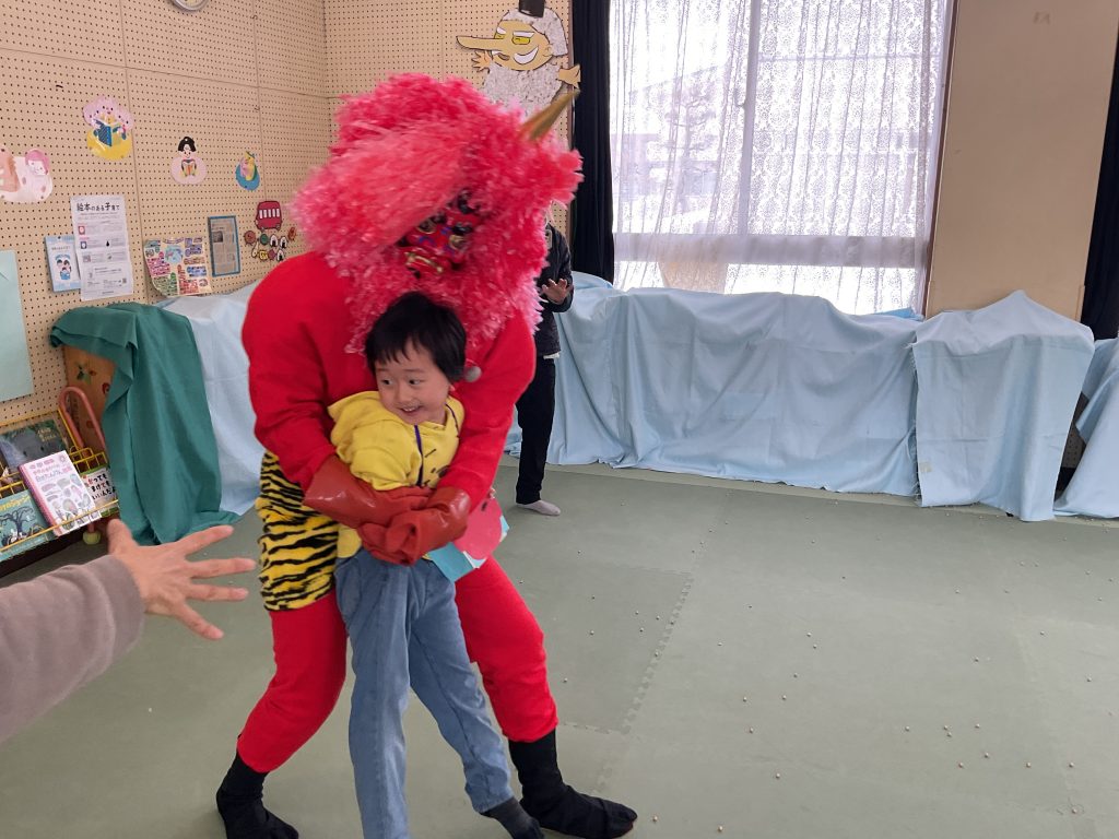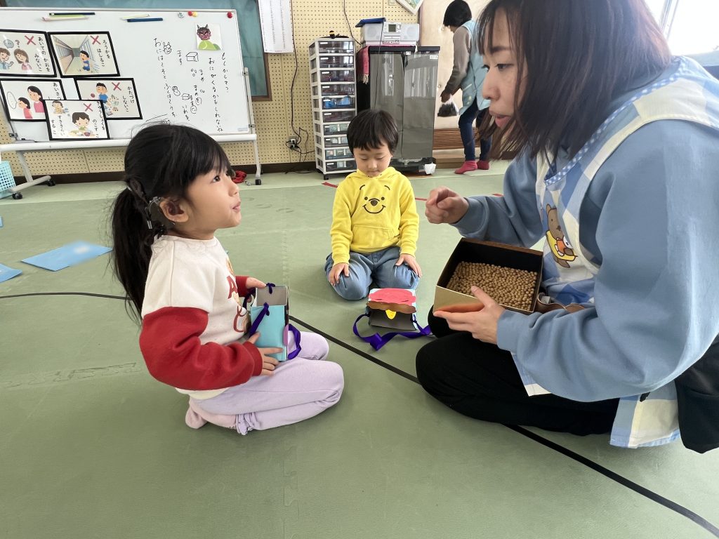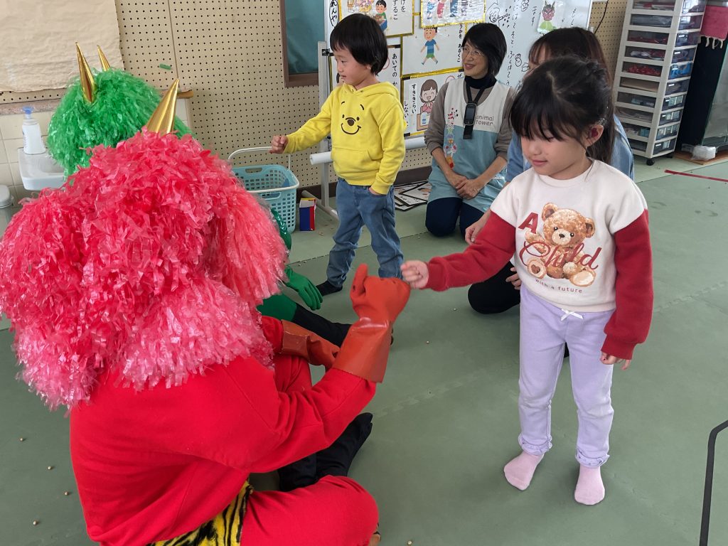 2/3(火)にまめまきを行いました。外から鬼が現れると子供たちは、驚きと怖さから友達同士ギュッと身を寄せていました。