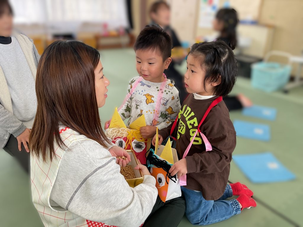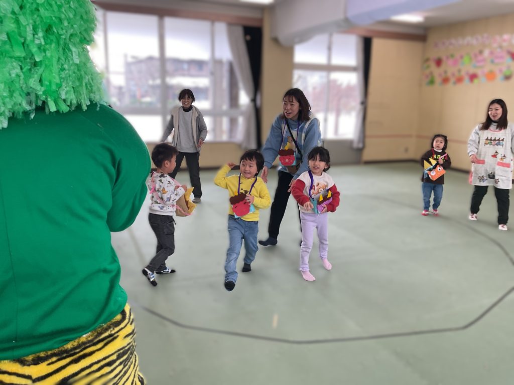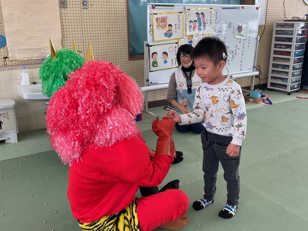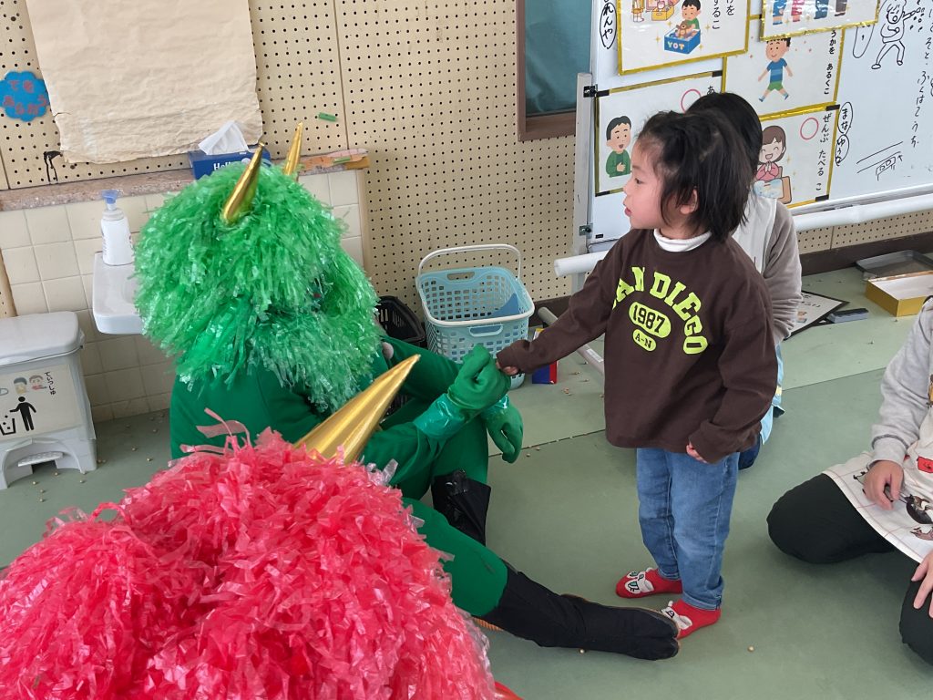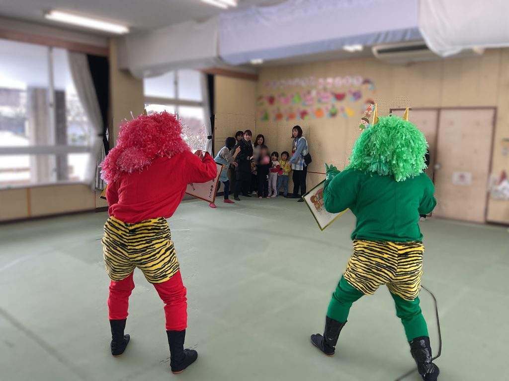 2/3(火)にまめまきを行いました。外から鬼が現れると子供たちは、驚きと怖さから友達同士ギュッと身を寄せていました。