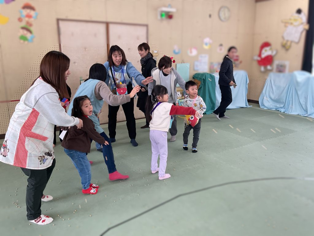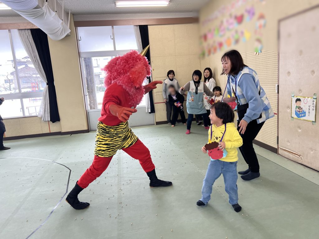 「悪い子はいないか?」「どこにいるかな?」と鬼がやってくると、子供たちは勇敢な姿で鬼に立ち向かいました!!お友達が襲われても助けに行き、鬼に豆を投げることができました。