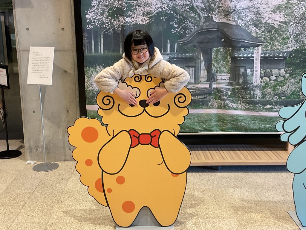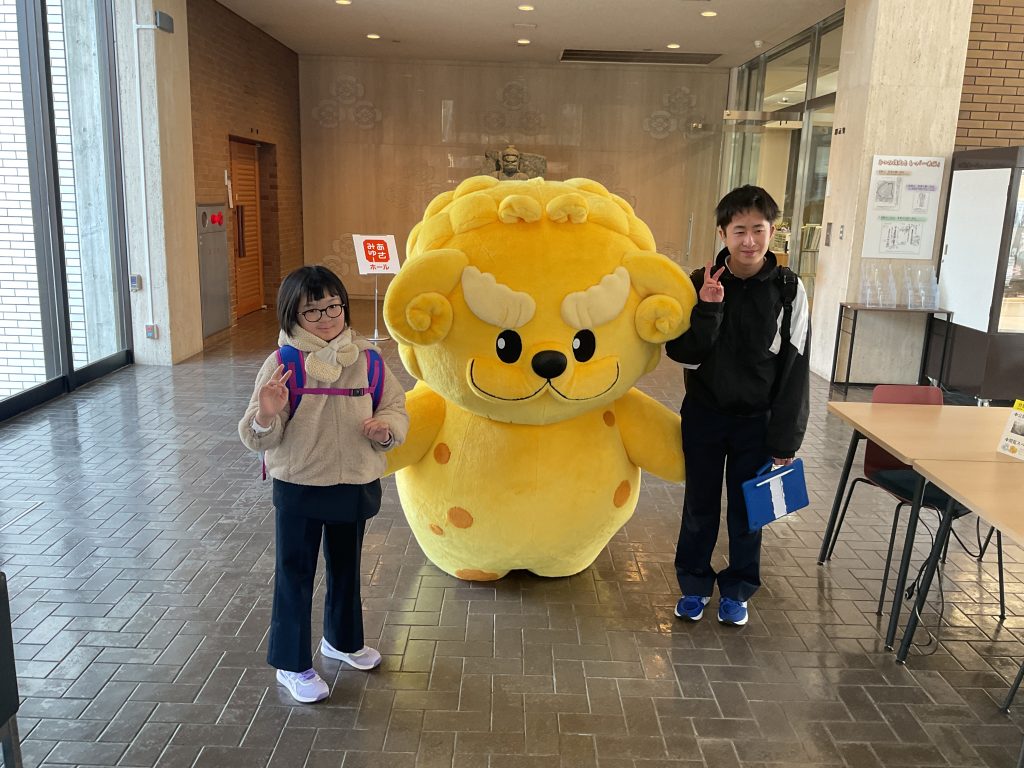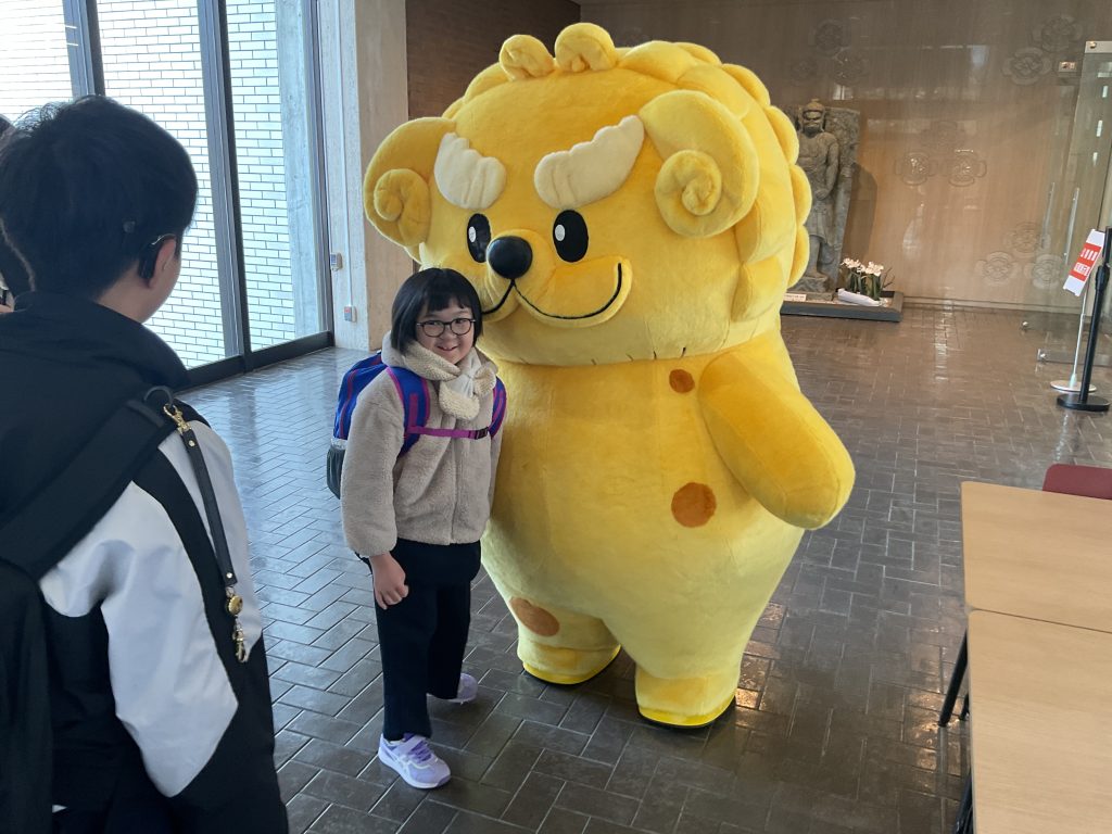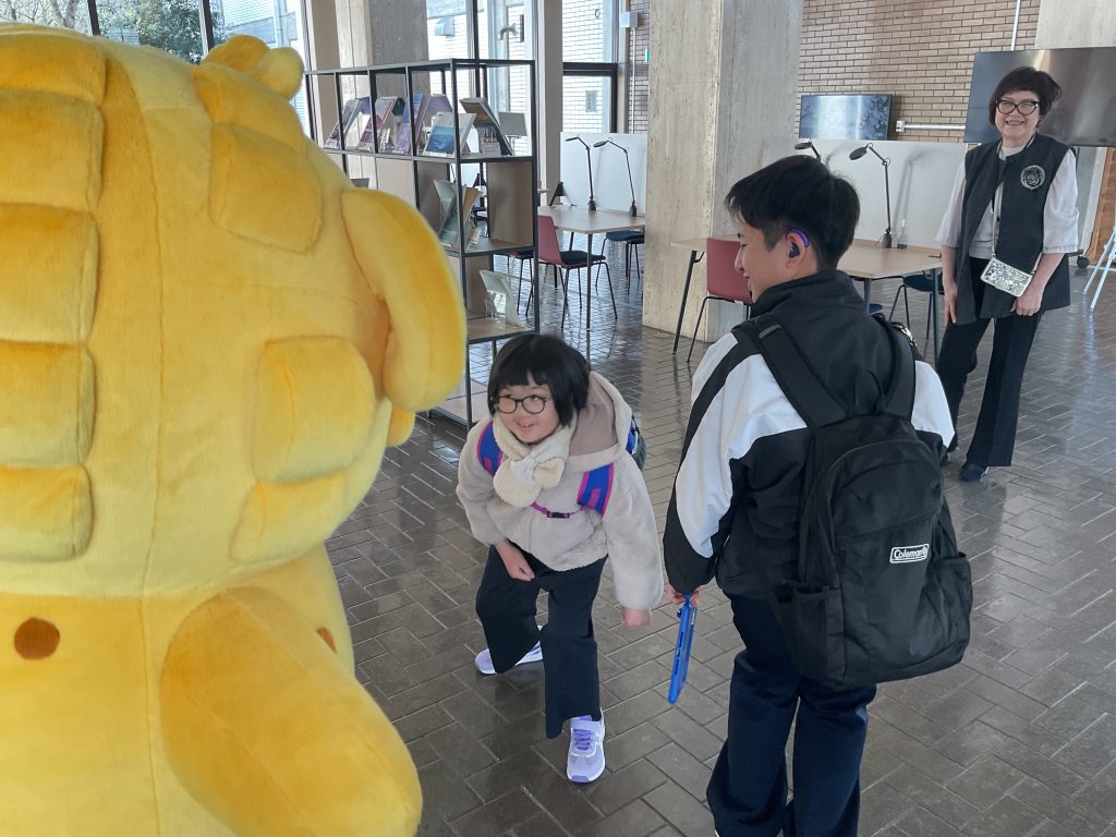 朝倉氏遺跡博物館に入ると、広報キャラクターの「シシカゲ」が出迎えてくれました。子どもたちはシシカゲの登場に驚きながらも、とてもうれしそうな表情を浮かべ、「シシカゲのしっぽを触ると喜ぶ」と聞くと、積極的にしっぽを触っていました。「ふわふわしている」「しっぽが餃子みたいな形をしていてかわいい」などの感想を口にしながら、シシカゲとの触れ合いを楽しんでいました。