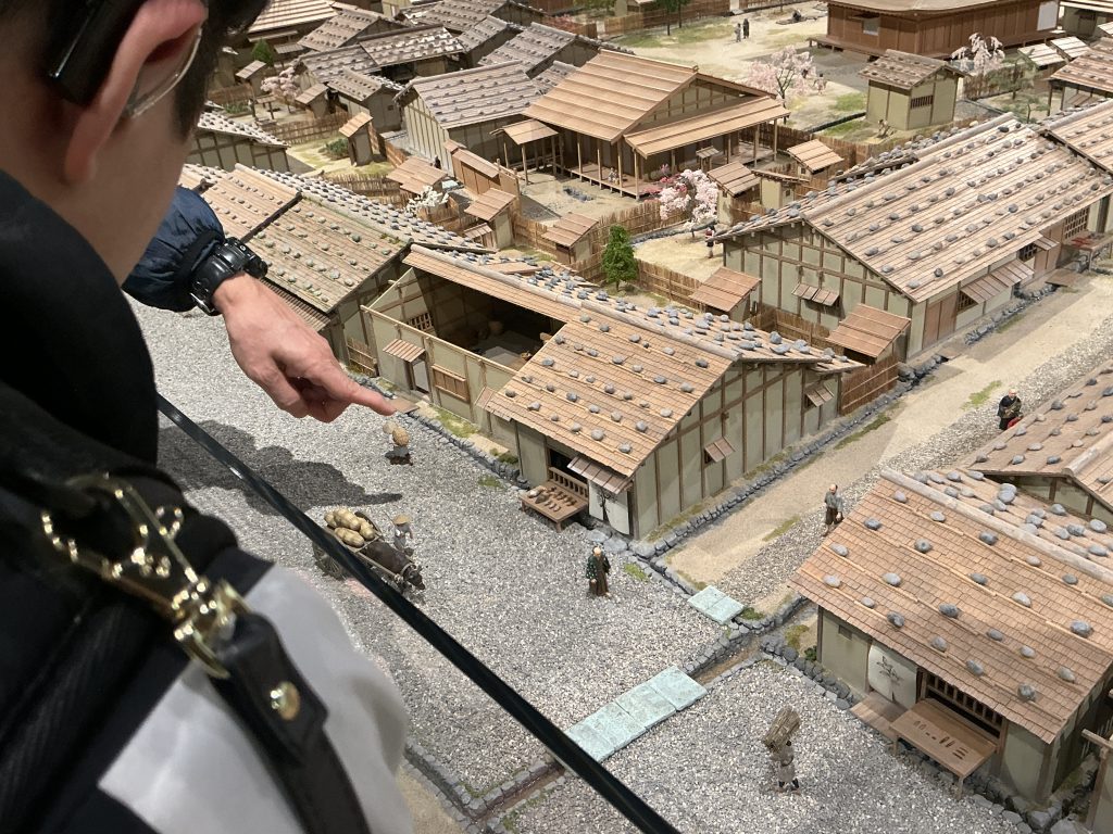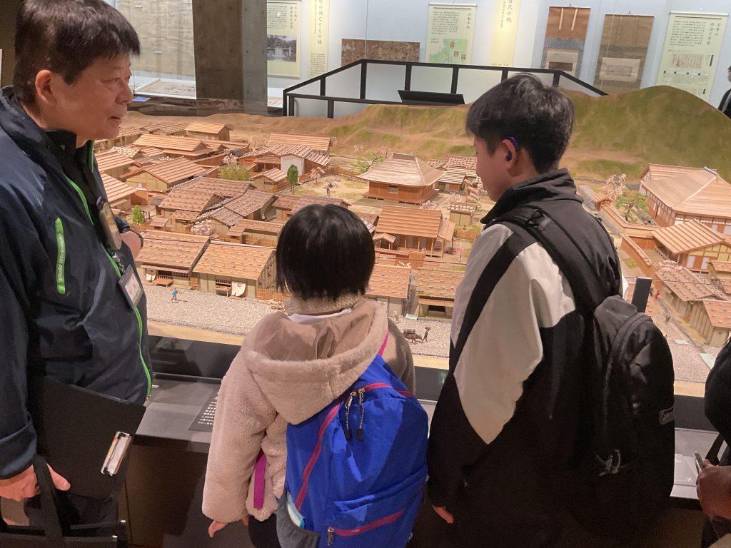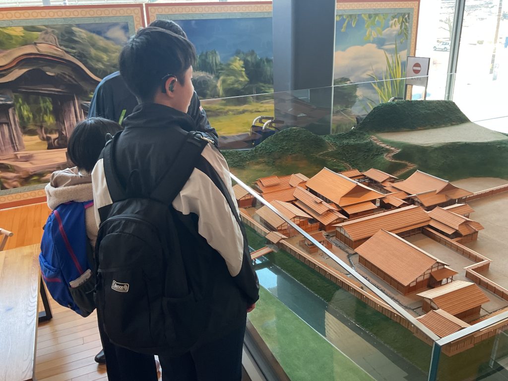 子どもたちは、当時の一乗谷の人々の暮らしを紹介する展示や、お殿様のお屋敷を再現した展示も見学しました。展示を見ながら「昔はトイレが家の外にあってびっくりした」という感想や、「お殿様のお屋敷にはたくさん部屋があるけれど、何のためにある部屋なのだろう?」という疑問をもっていました。