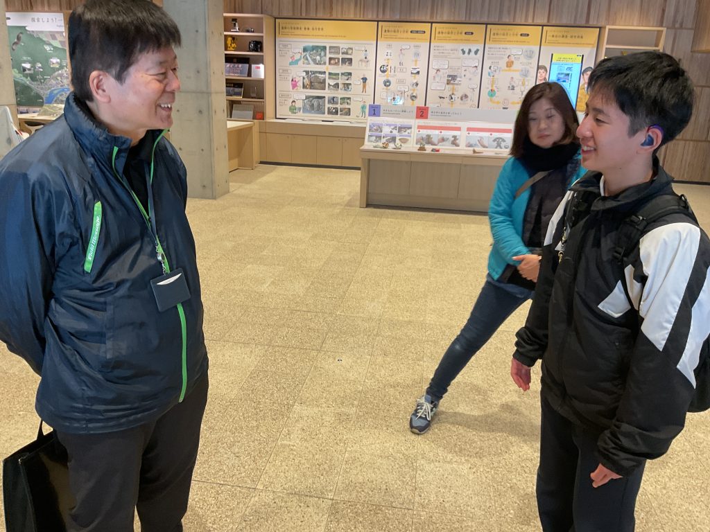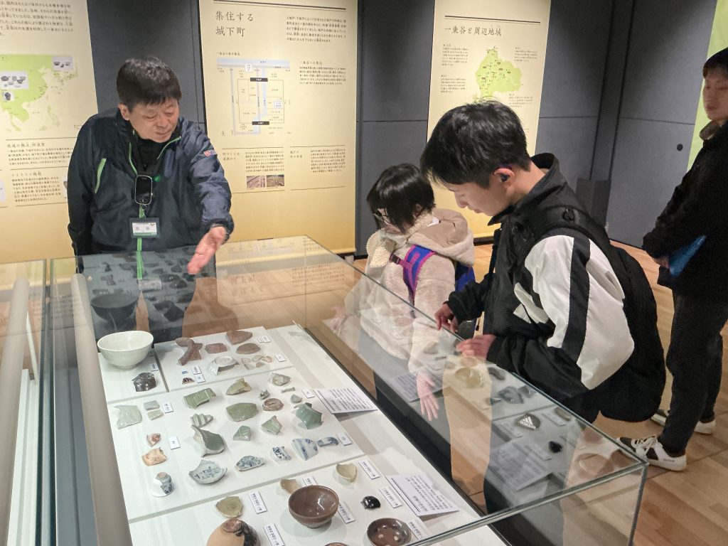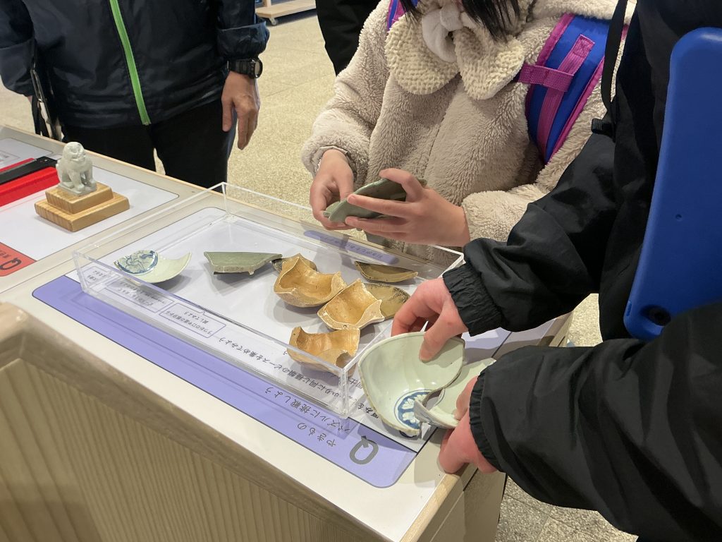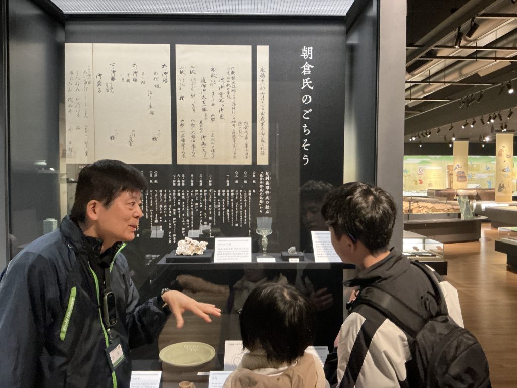 シシカゲと触れ合った後、博物館で戦国時代に一乗谷に住んでいた人の生活について学習しました。一乗谷では昔のおわんやおさらといった食事に使う道具やお米がこげたもの、貝がら、魚の骨などが多く発掘されているということを知り、一乗谷では海産物がよく食べられていたということ、そこまで裕福ではないものの、しっかりと食事をとっていたことを学ぶことができました。