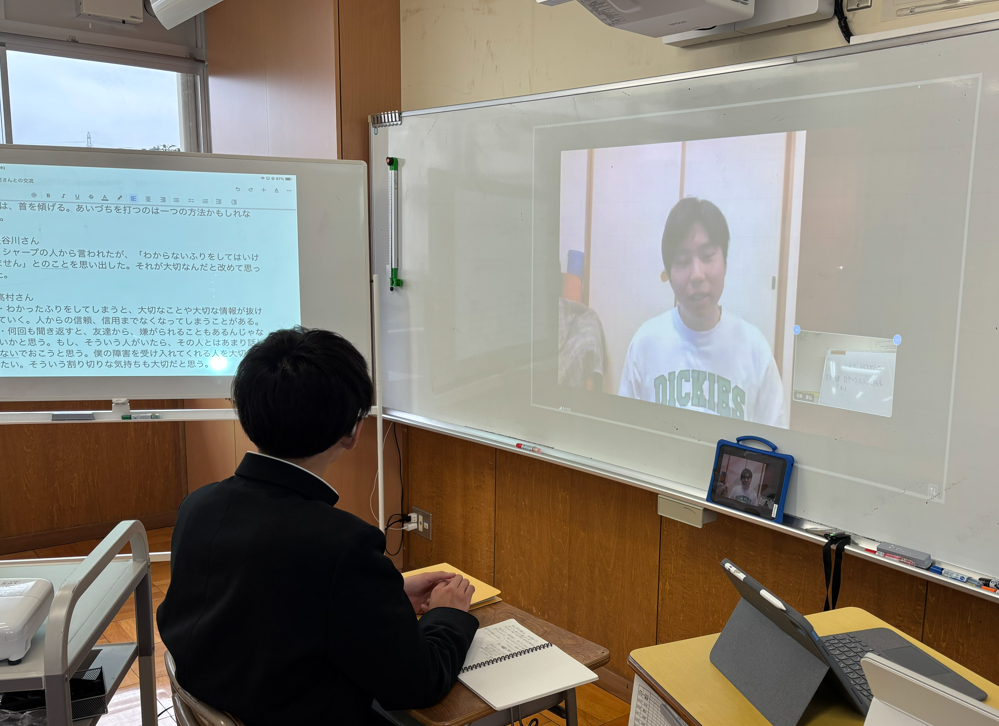 その一つとして、東京の大学に通う難聴学生とのオンライン交流を定期的に実施しています。2月25日(水)のオンライン交流では、生徒が、自分自身にとって「音声・手話・文字情報」がどのようなものか、これまでの学習を通して考えたことを発表しました。そのあと、難聴学生Aさんから、ご自身の考えを語っていただいたり、アドバイスをもらったりしました。生徒は、授業の最後まで難聴学生Aさんに熱心に質問をしていました。