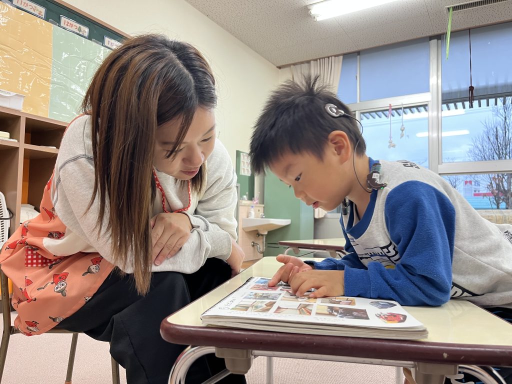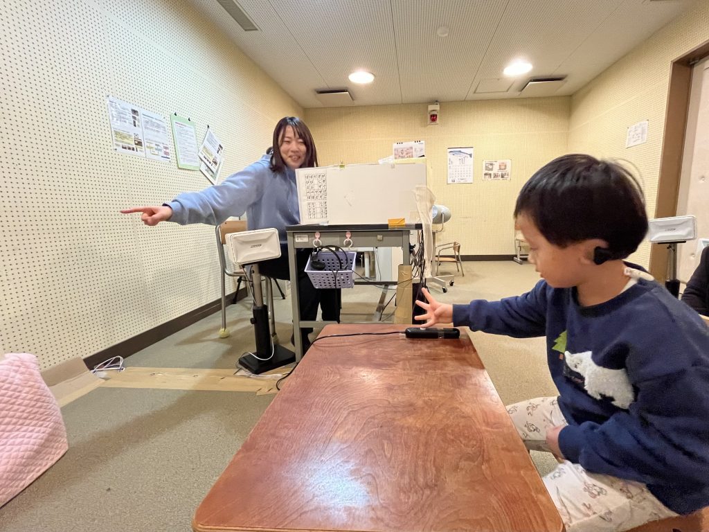 聴力測定で、子どものきこえの状態を調べ、補聴器調整をします。また、音やことばの聴き分けなど聴覚学習も行っています。